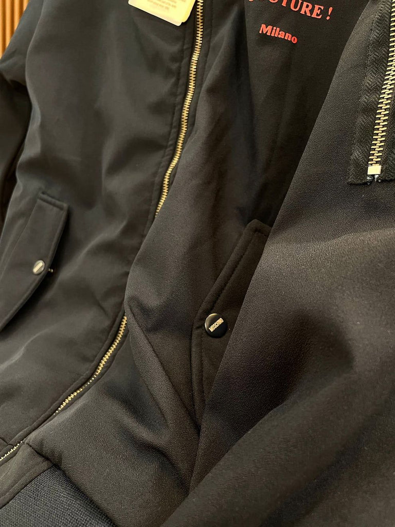 - There is a cool utility pocket on the left sleeve with a zipper and a metal ring pull, adding a military-inspired touch.