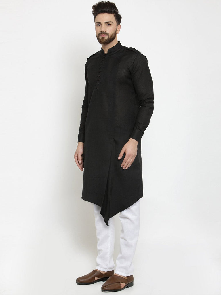 Black Kurta With Aligarh Pajama Set in Linen For Men by Luxury at Less