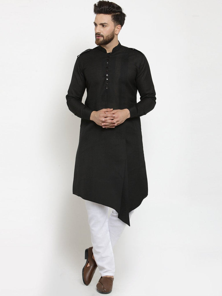 Make your occasion special with latest in trend Black solid Designer Kurta Pajama set which has mandarin collar long sleeves, Asymmetric Hem and Front Slit. Explore the wide range of Finest Quality Lenin Kurta Pajama for Men by Luxury at Less. Check out the entire Ethnic Collection for Men by Luxury at Less Online.