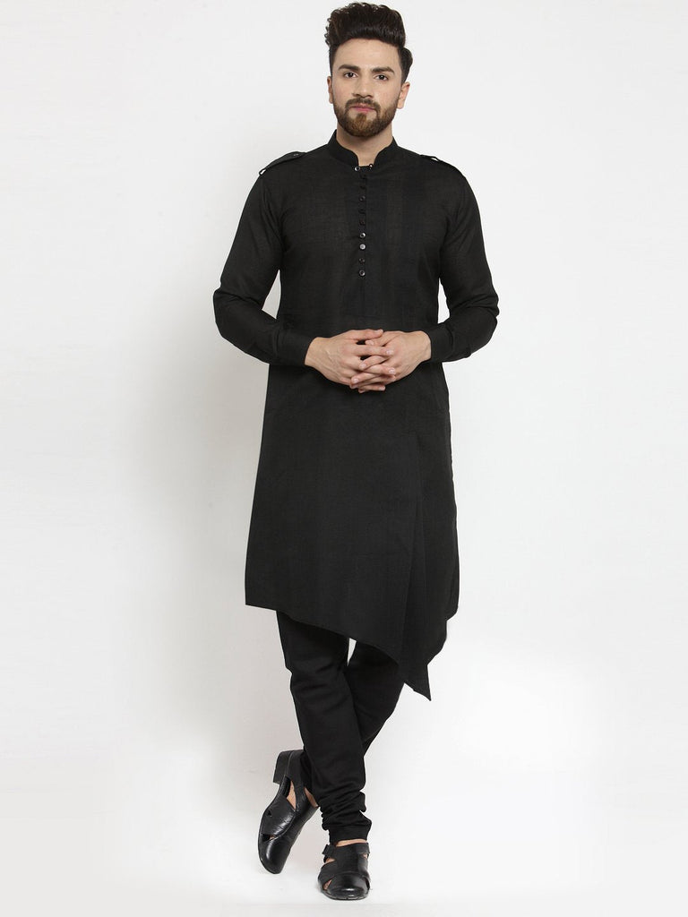Black Kurta With Churidar Pajama Set in Linen For Men by Luxury at Less