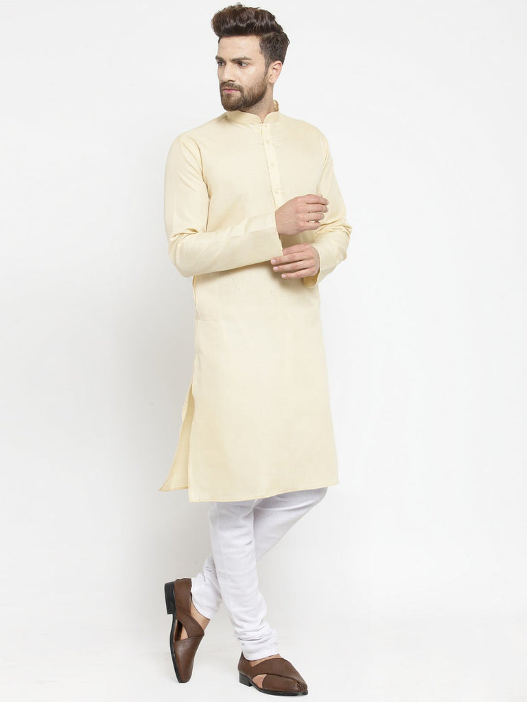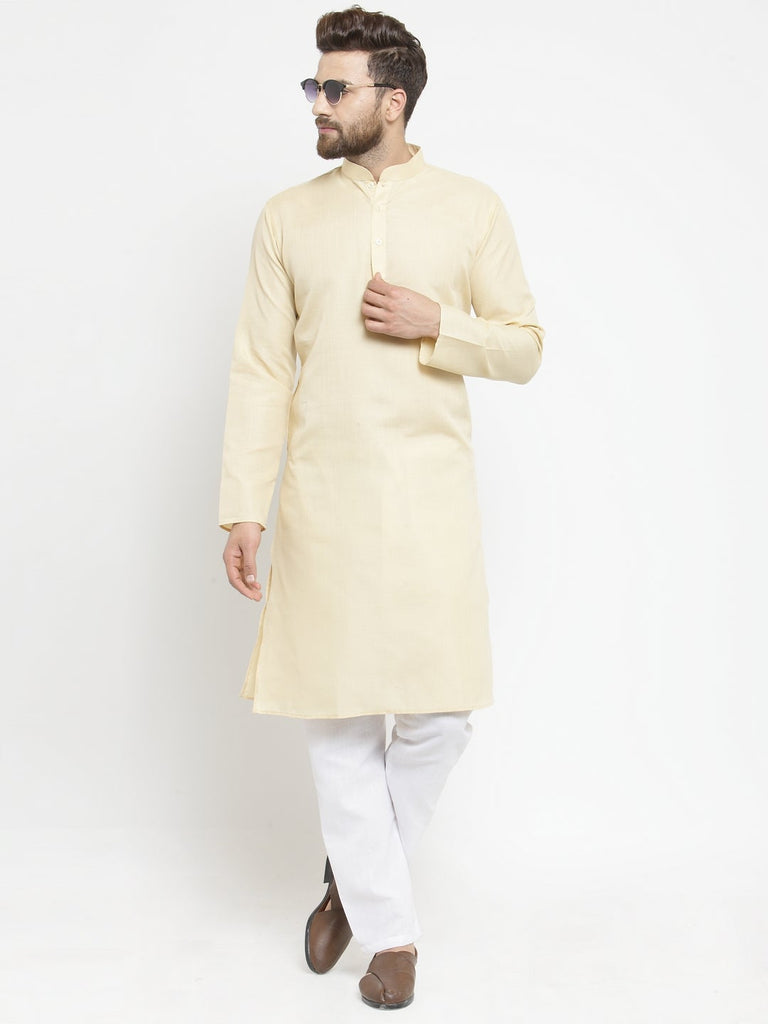 This kurta set for men is suitable for ethnic occasions, family functions and gatherings. The colour adds extra brightness to the style on mens. The stand-up Mandarin Neck adds a taller appeal to the wearer. The collar has square edges with button closure.The Kurta has two side pockets for convenience. It can be used to carry keys, pens, mobile phones or wallets.