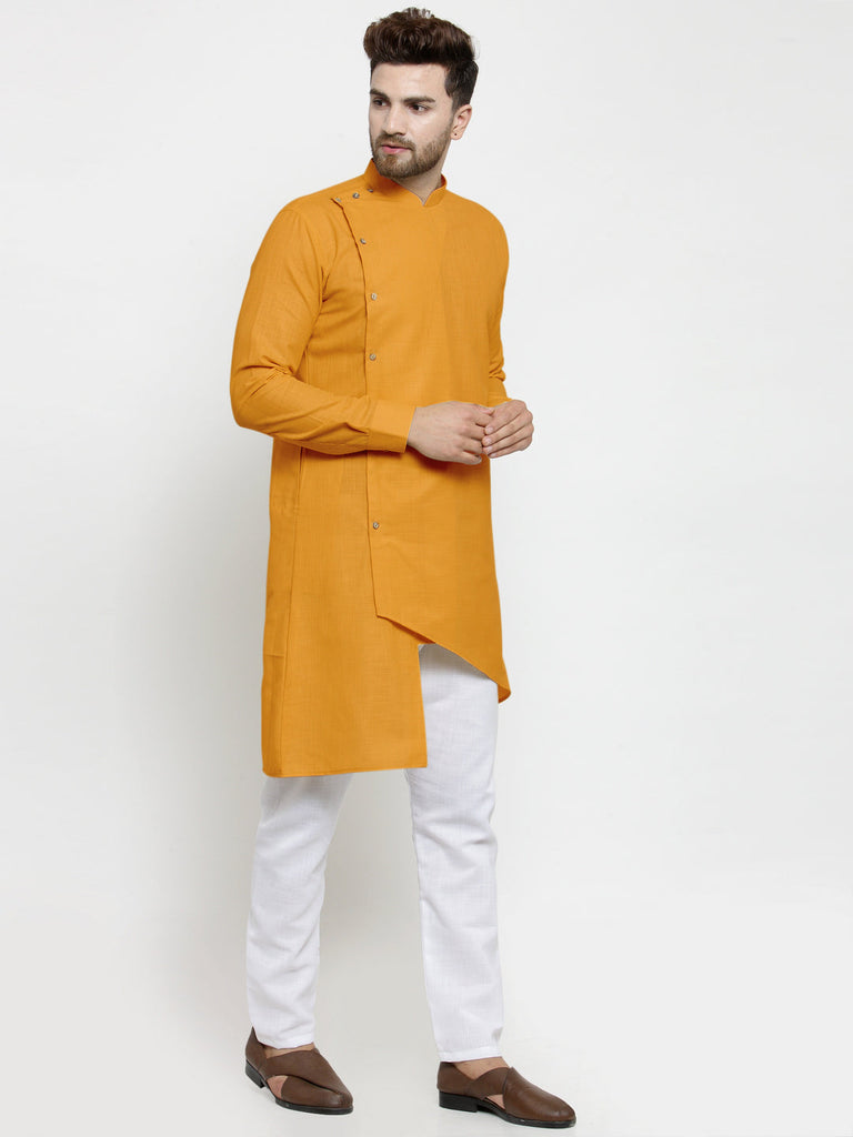 Designer Mustard Yellow Linen Kurta With White Aligarh Pyjama For Men By Luxury at Less