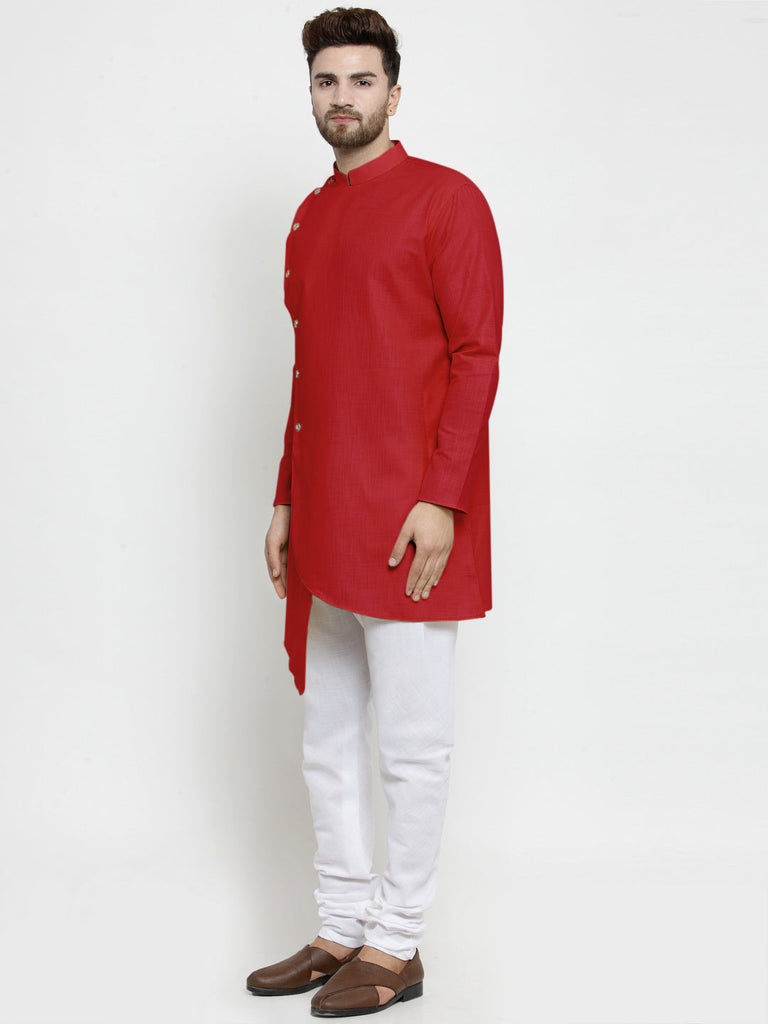 Designer Red Linen Kurta With White Churidar Pajama For Men By Luxury at Less