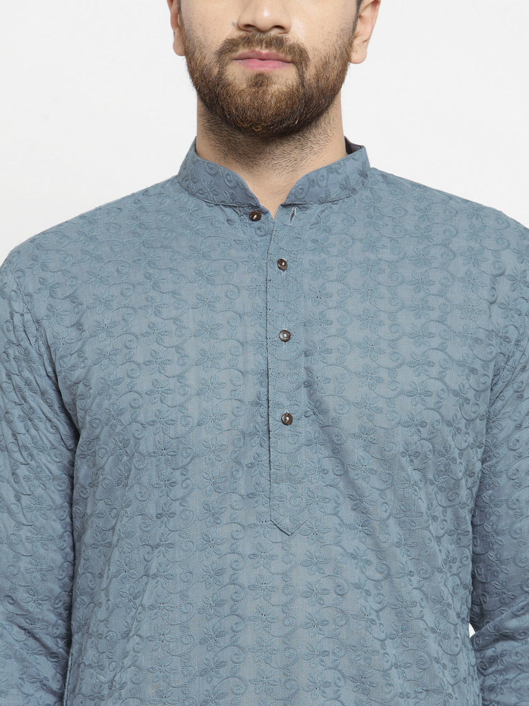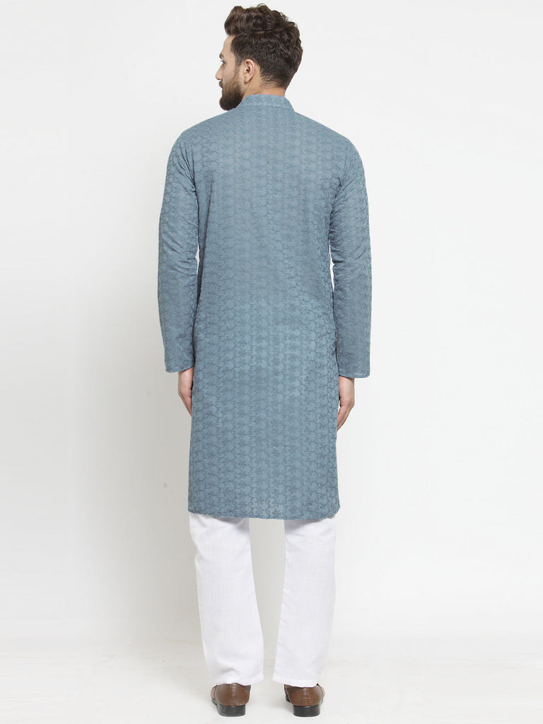 Grey Cotton Chikankari Lucknowi Jaal Embroidered Kurta with Aligarh Pajama For Men by Luxury at Less