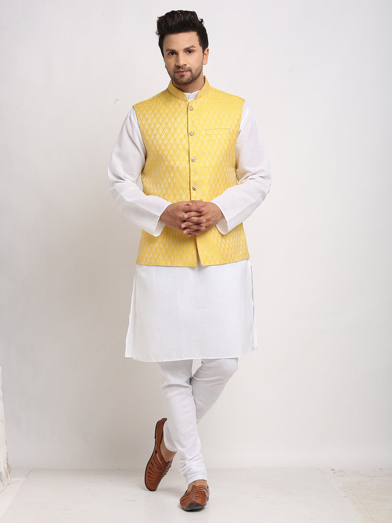 Luxury at Less Ethnic Plain White Kurta Pajama With Brocade Yellow Nehru Jacket For Men