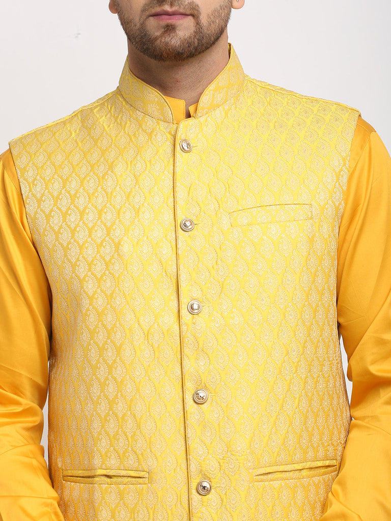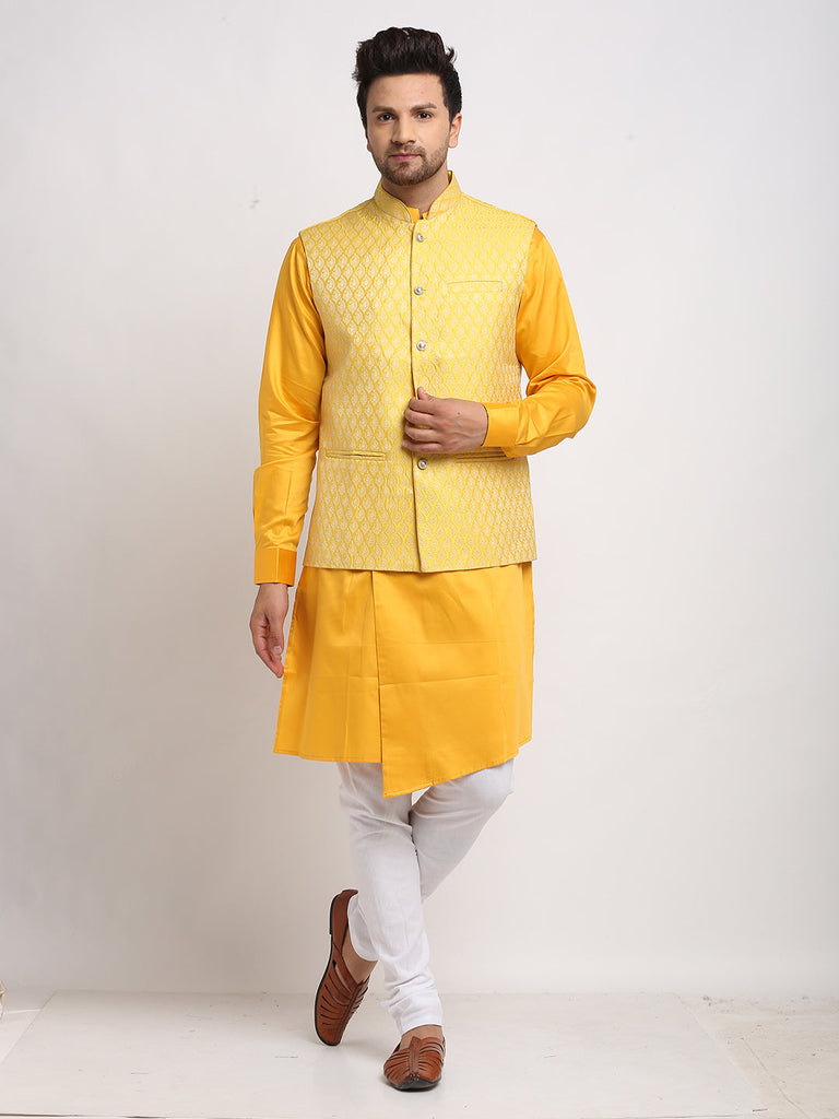 Luxury at Less Ethnic Cotton Blend Yellow Kurta Pajama With Brocade Yellow Nehru Jacket For Men