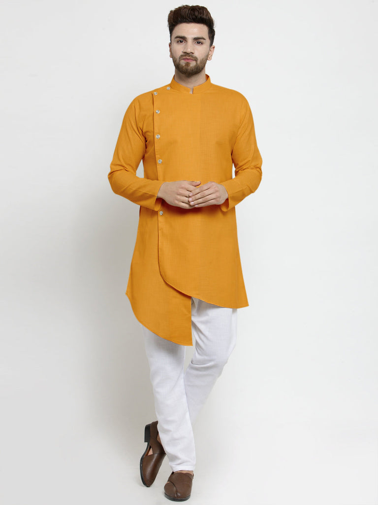 Designer Mustard Yellow Linen Kurta With White Aligarh Pajama For Men By Luxury at Less