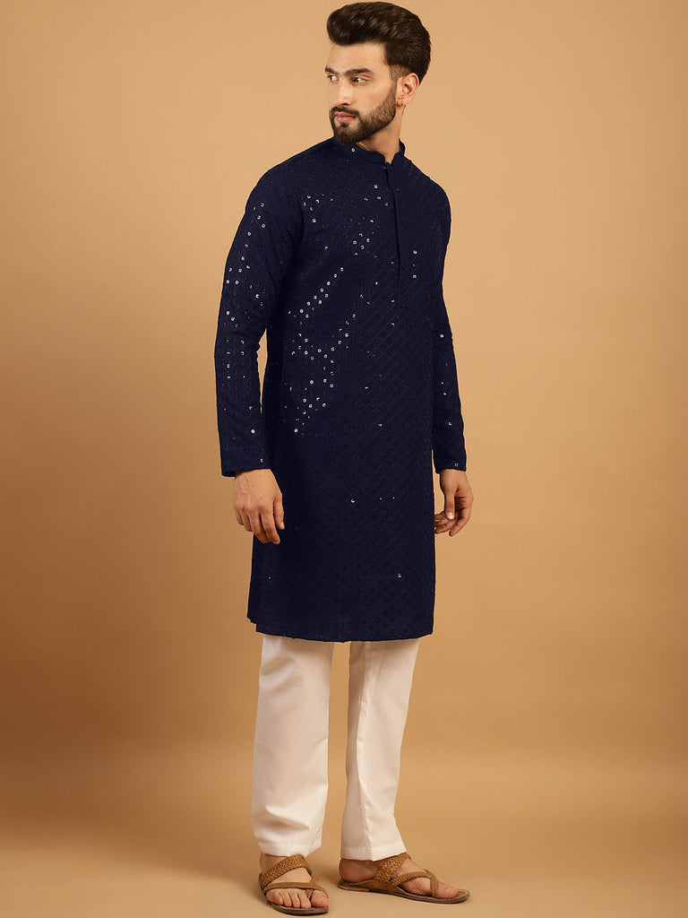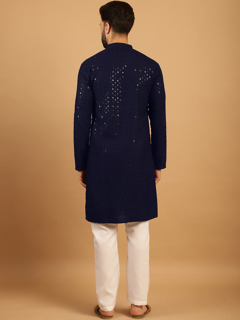 Embellished Sequinned Chikankari Embroidered Navy Blue Kurta Pajama Set by Luxury at Less