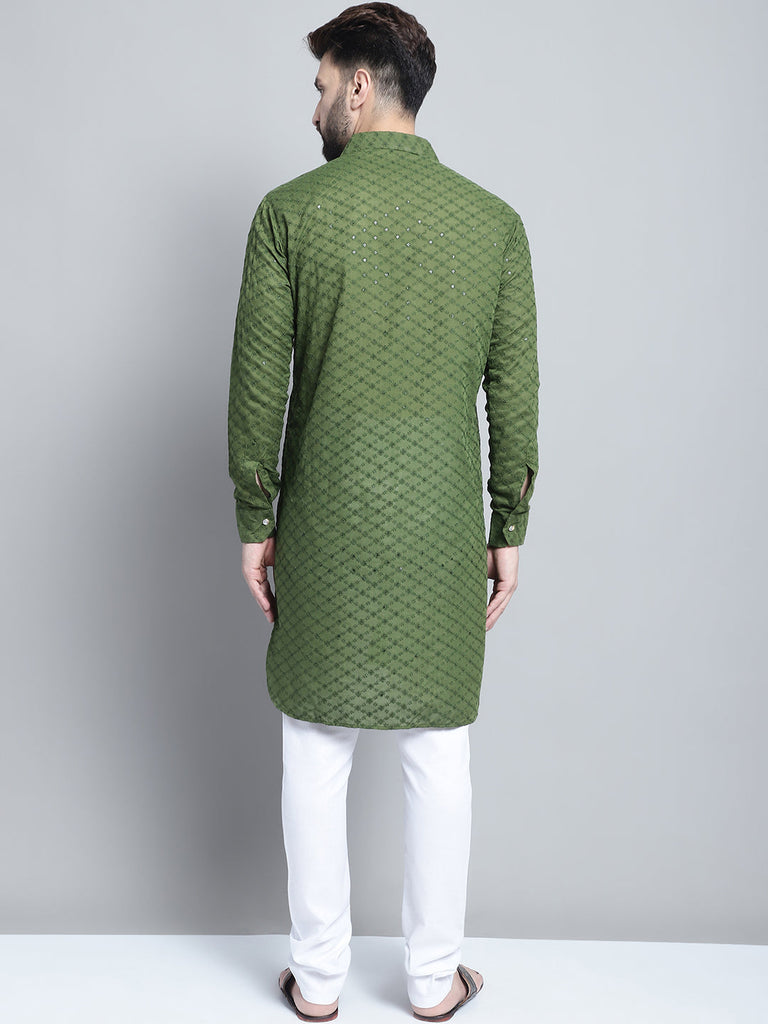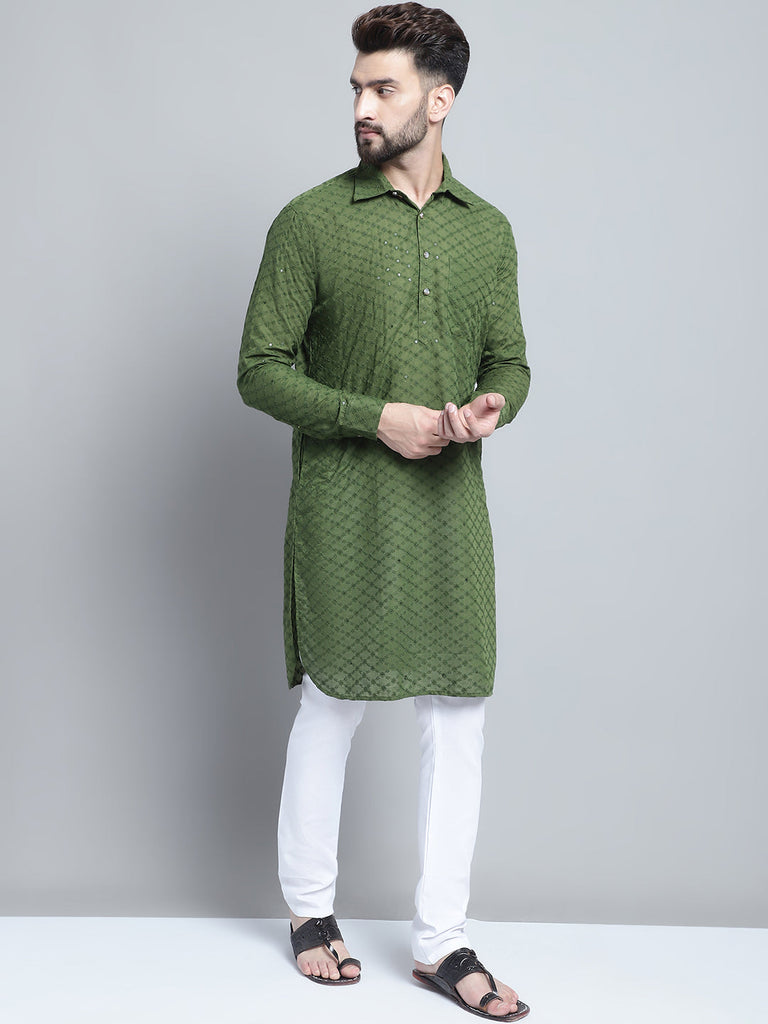 Embroidered Cotton Chikankari Green Pathani Kurta Pajama Set by Luxury at Less