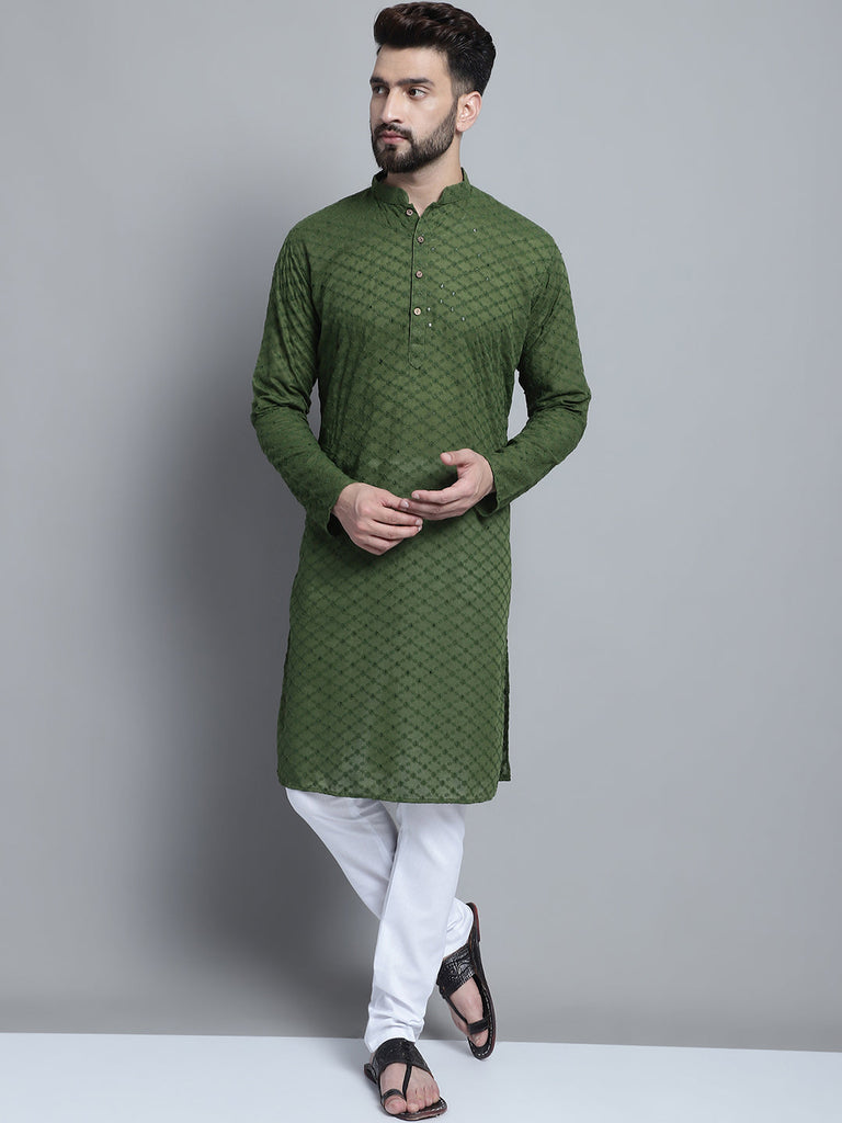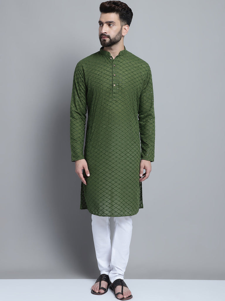Green Chikankari Embroidery Cotton Kurta Pajama Set by Luxury at Less