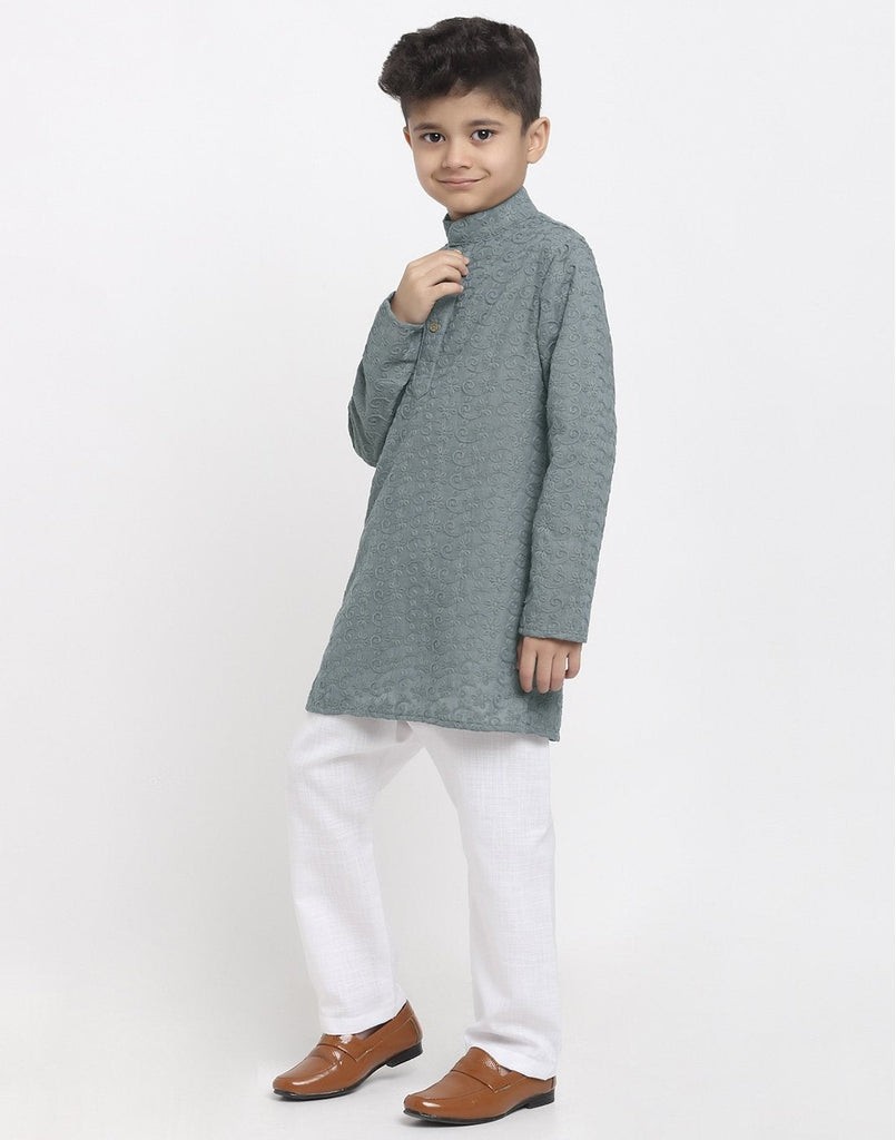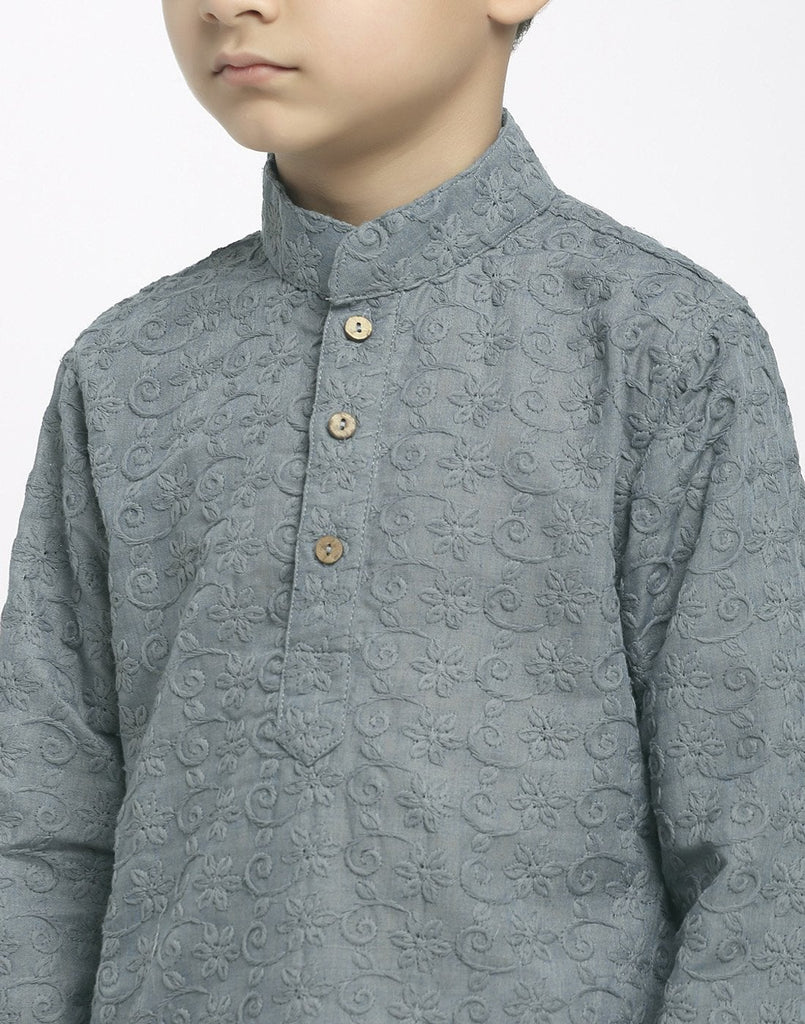 Lucknowi Chikankari Cotton Kurta Pajama Set For Boys/Kids By Luxury at Less|Grey| Kurta Pajama Set
