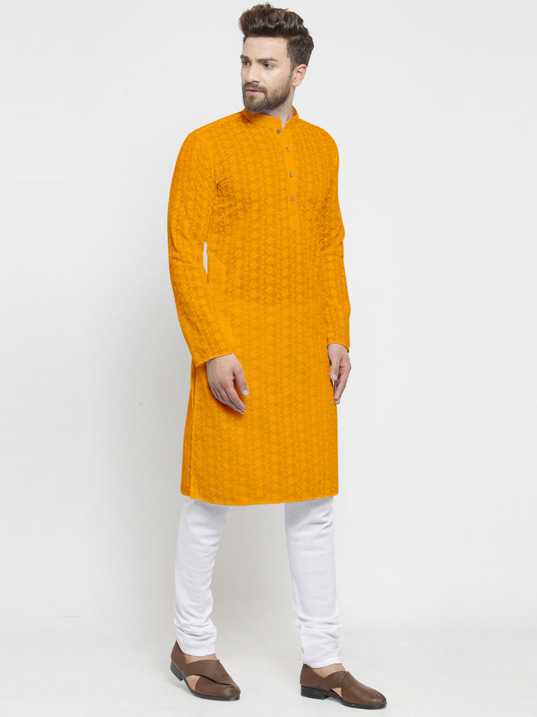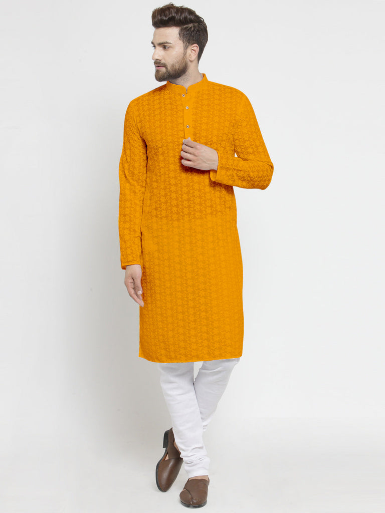 Mustard Yellow Cotton Chikankari Lucknowi Jaal Embroidered Kurta with Churidar Pajama For Men by Luxury at Less