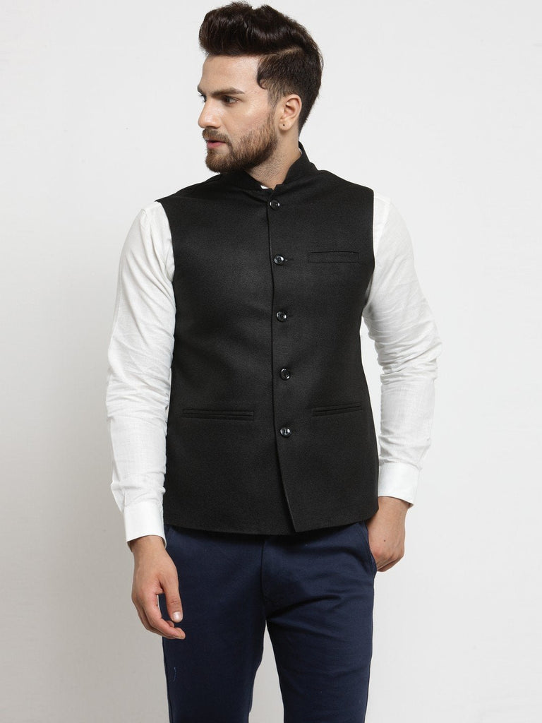 Black Nehru jacket has a mandarin collar, a full button placket, sleeveless, three welt pockets, vented hem, an attached lining with two inner pockets.