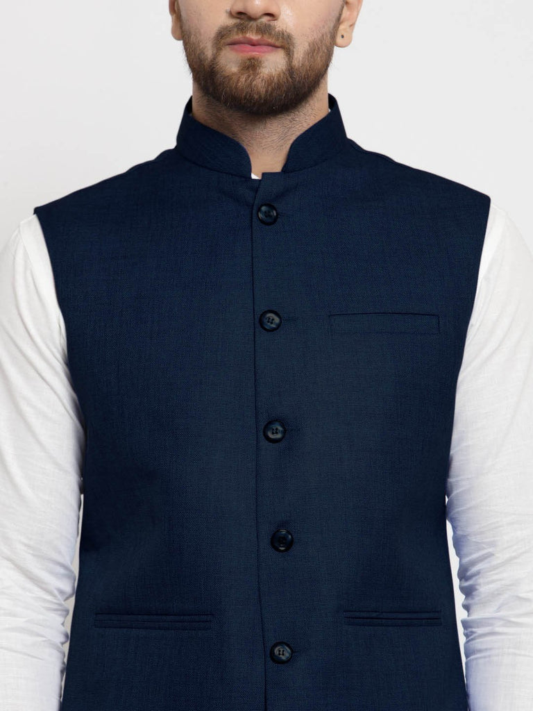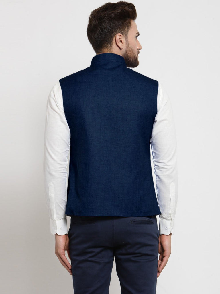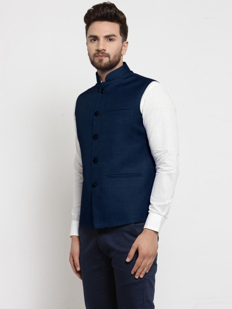 Men Dark Blue Solid Nehru Jacket By Luxury at Less