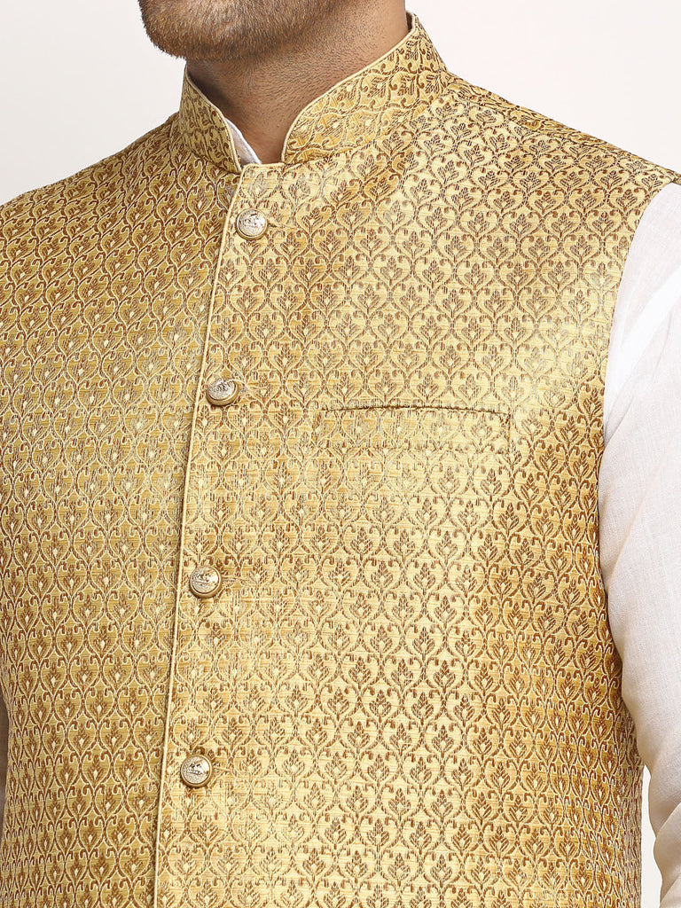 * Ethnic Brocade Silk Dark Golden Nehru Jacket With Golden Zari Work.