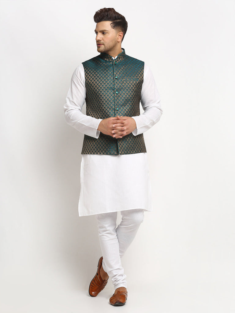 New Designer Men Dark Green Brocade Nehru Jacket With Golden Work By Luxury at Less