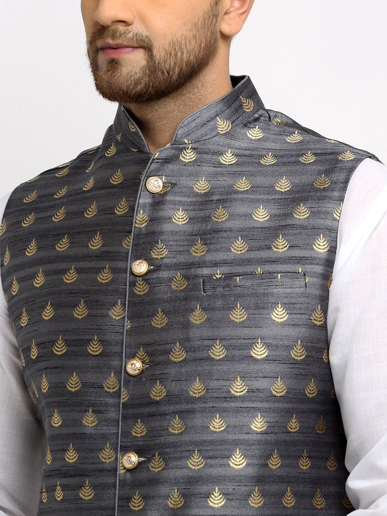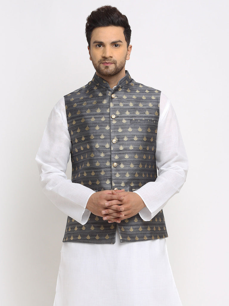 New Designer Men Dark Grey and Golden Brocade Nehru Jacket With Golden Work By Luxury at Less