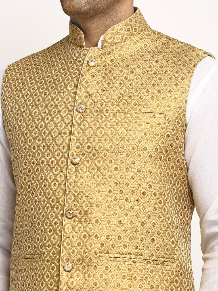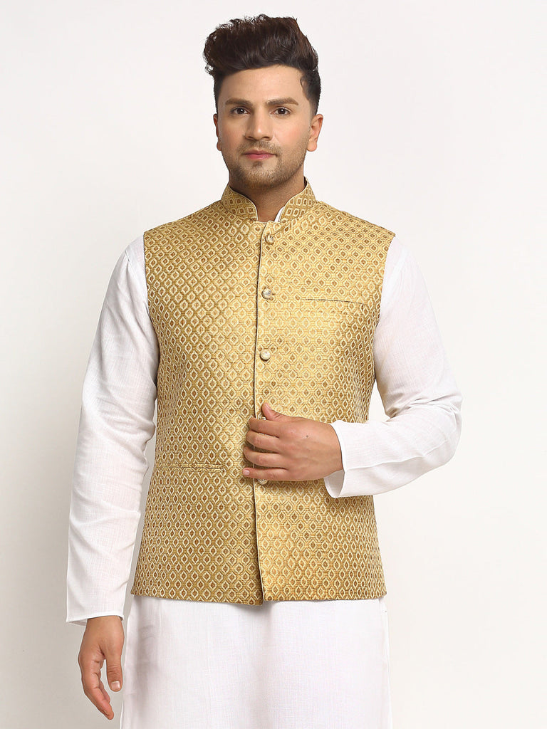 * Ethnic Brocade Silk Golden Nehru Jacket With Golden Zari Work.
