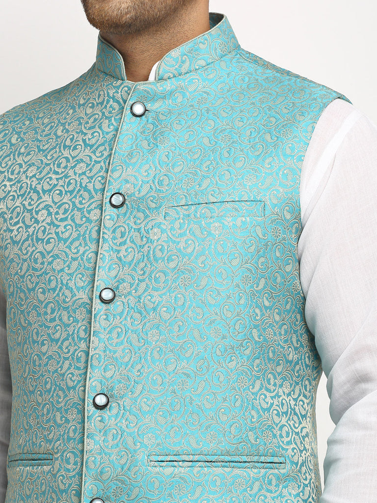 New Designer Men Turquoise Blue Brocade Nehru Jacket By Luxury at Less