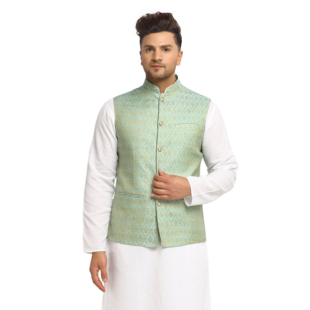* Ethnic Brocade Silk Turquoise Green Nehru Jacket.* Luxury at Less brings you the Ethnic Brocade Silk Nehru Jacket, which gives a distinct look to your casual attire or your ethnic look with this trendy Nehru jacket. Wear this ehtnic jacket with a shirt and a pair of jeans and loafers to look trendy, timeless and versatile or team it up with a kurta pyjama to look your ethnic bast. Dress up in style with this good looking Nehru jacket.This jacket is a perfect addition to your wardrobe.