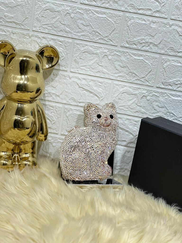 Crafted with meticulous attention to detail, the clutch features a three-dimensional cat shape, expertly carved from high-quality crystal. The crystalline surface captures and reflects light, creating a mesmerizing play of sparkle and shine.