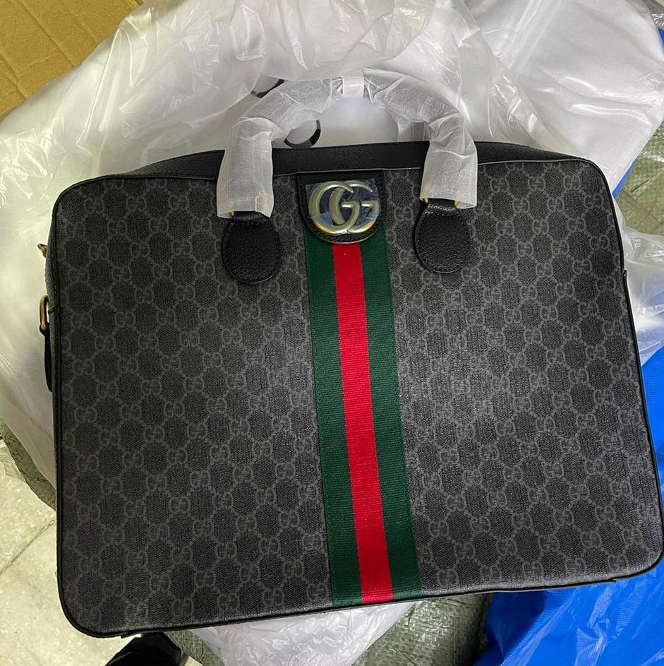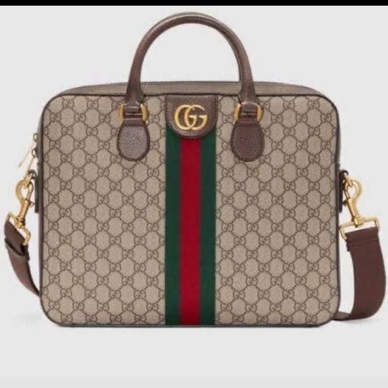 Coated canvas pouch in beige featuring logo pattern in brown throughout. Grained leather trim in brown throughout. Signature green and red webbing trim at front