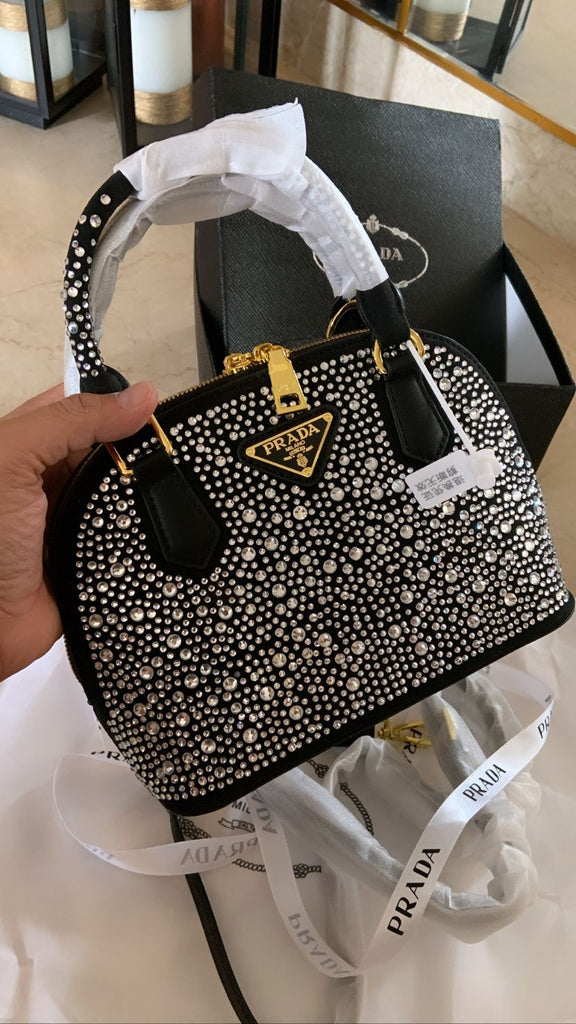 Latest Branded black handbag, detailed with different size Crystal over it. Thins comes along with detachable shoulder strap giving it two different effect of hand bag and shoulder bag. This is best choice for a cocktail evening.