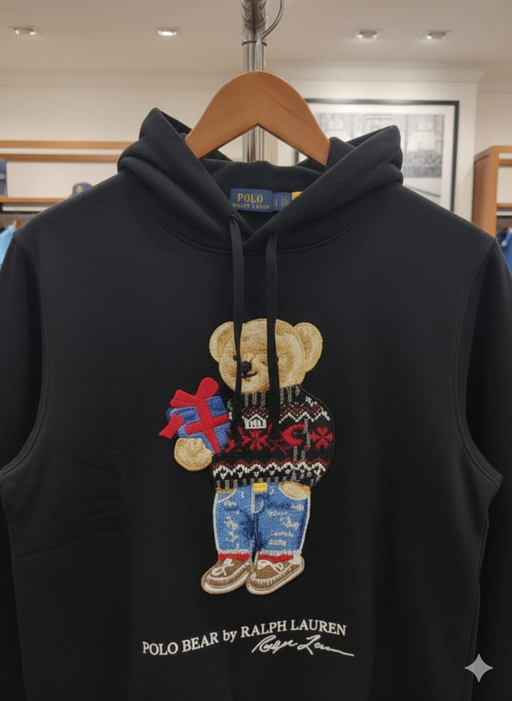 Iconic Polo Bear embroidery holding a gift for a stylish festive look
