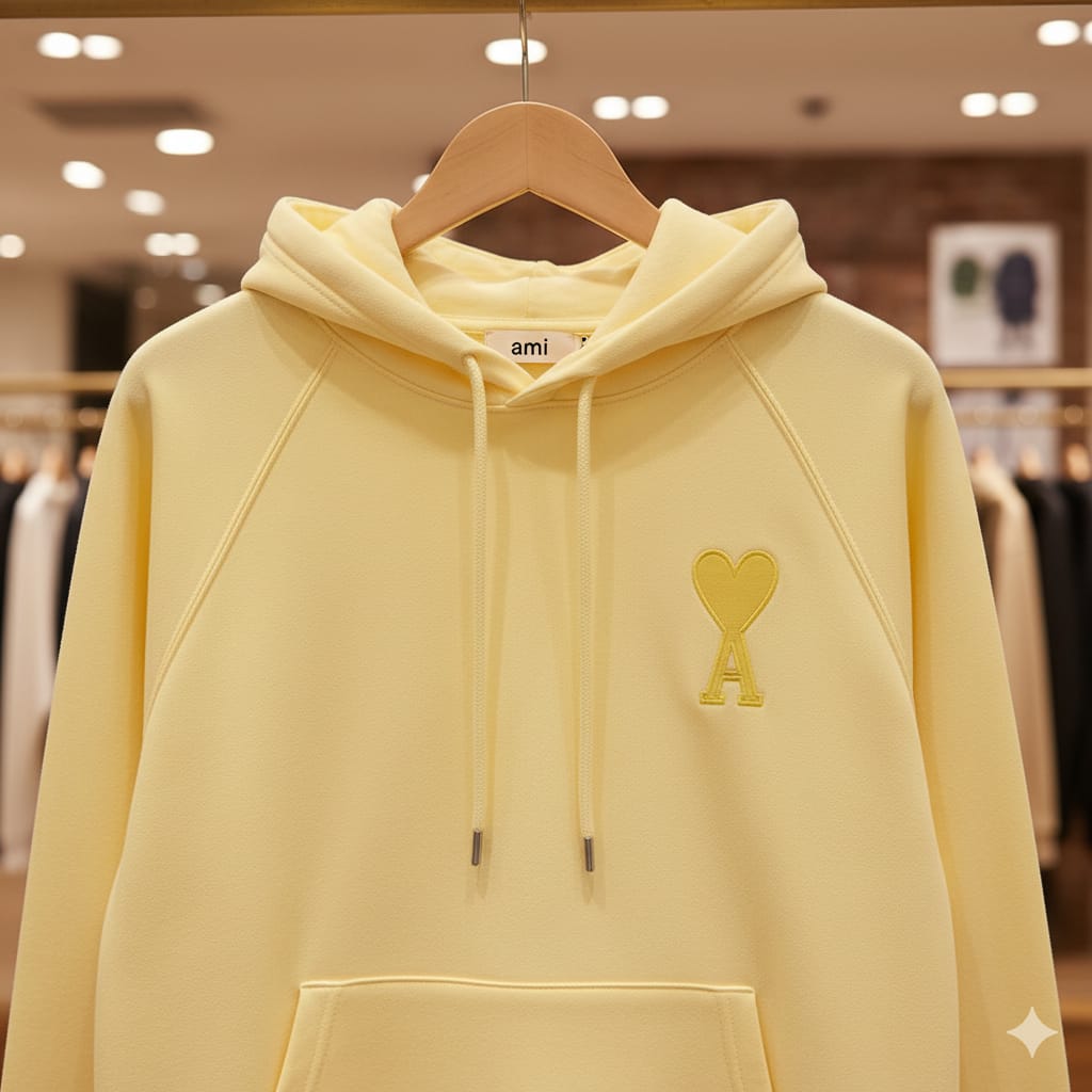 Step up your casual wear with this pastel yellow pullover hoodie – a perfect mix of subtle color and standout style. Made from soft, heavyweight cotton, it features a cozy hood with adjustable drawstrings, a roomy kangaroo pocket, and a unique heart and letter chest logo that adds a signature touch.