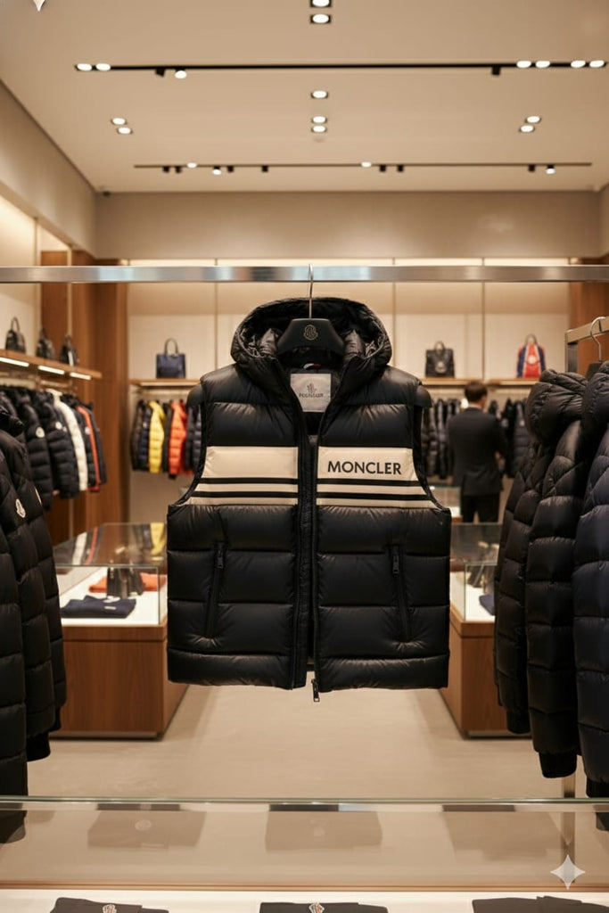 Stylish black puffer vest with a glossy, premium finish.