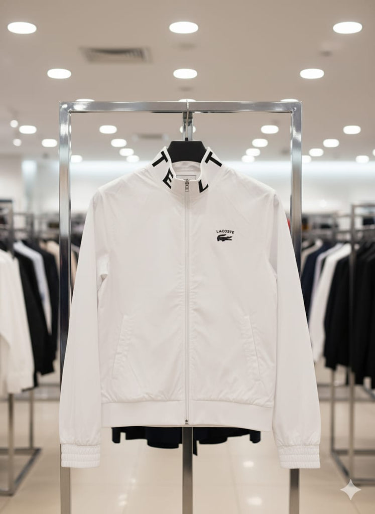 • The standing collar has a bold black and white graphic print around the back, adding a modern edge.