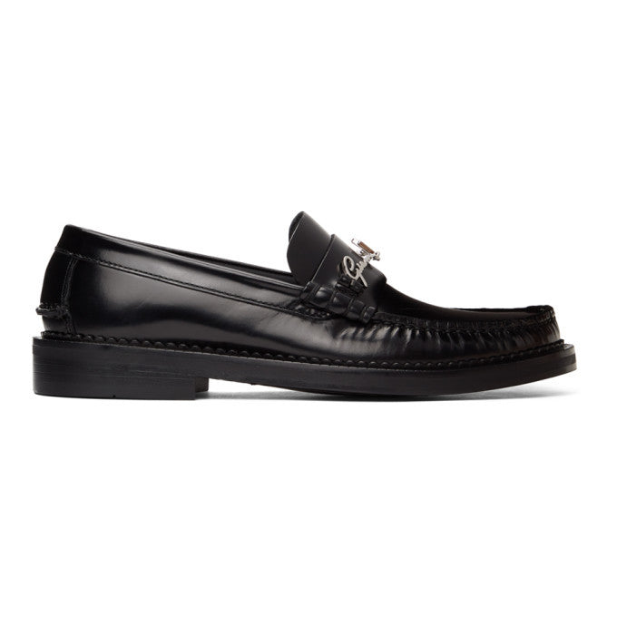 Buffed leather loafers in black. Round moc toe. Logo hardware at vamp. Buffed leather lining. Raised seam at heel counter. Scalloped detailing at welt. Stacked leather heel. Tonal leather outsole. Silver-tone hardware