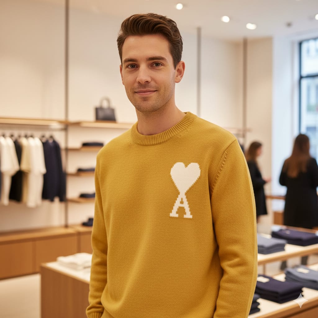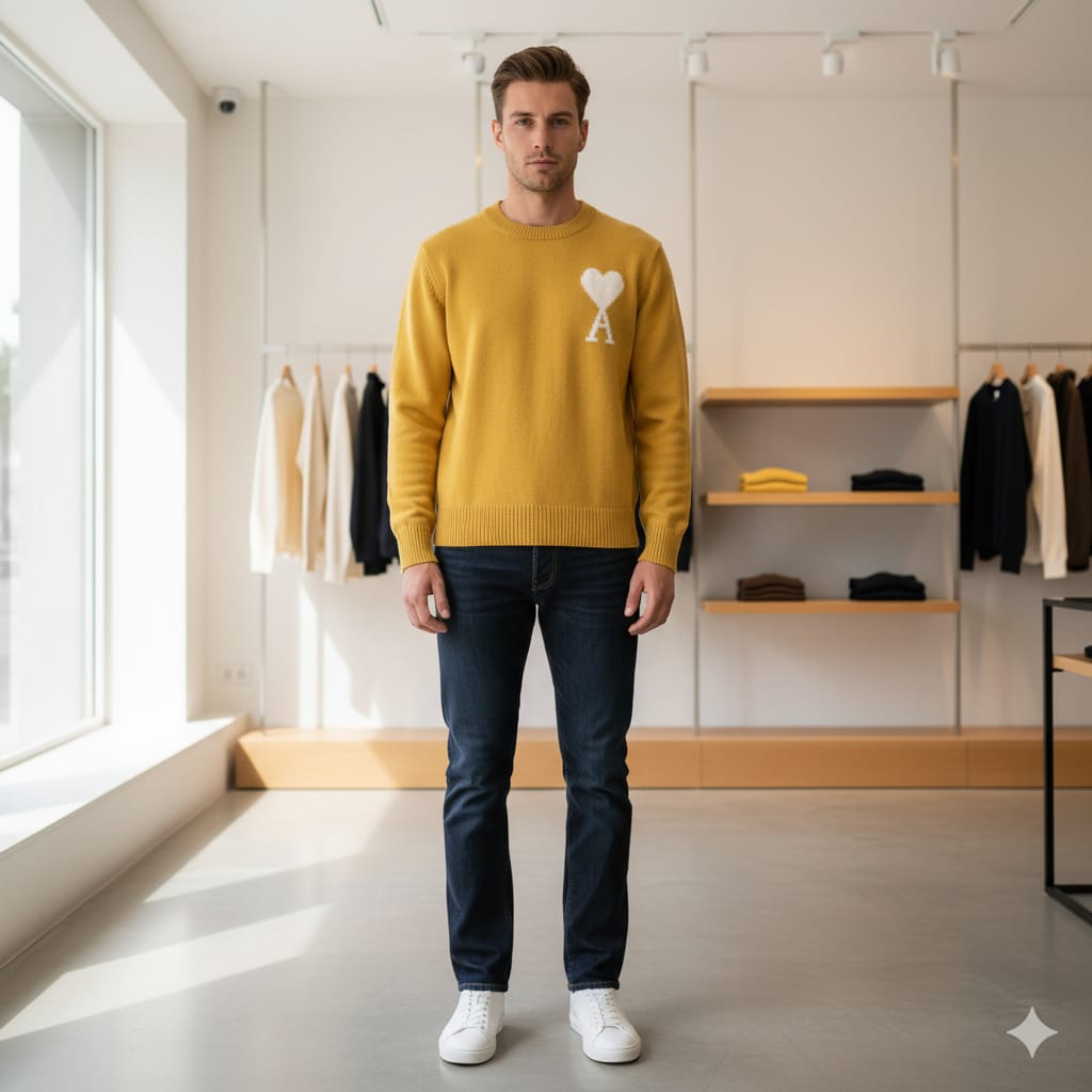 - Vibrant yellow crewneck sweater with the signature brand heart logo in white, embroidered on the chest