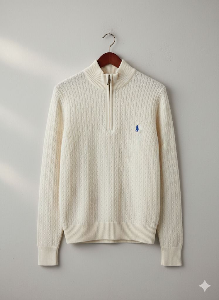 • Rib-knit mockneck. Quarter-zip placket. Custom-developed suede zip pull with a "Polo" logo.