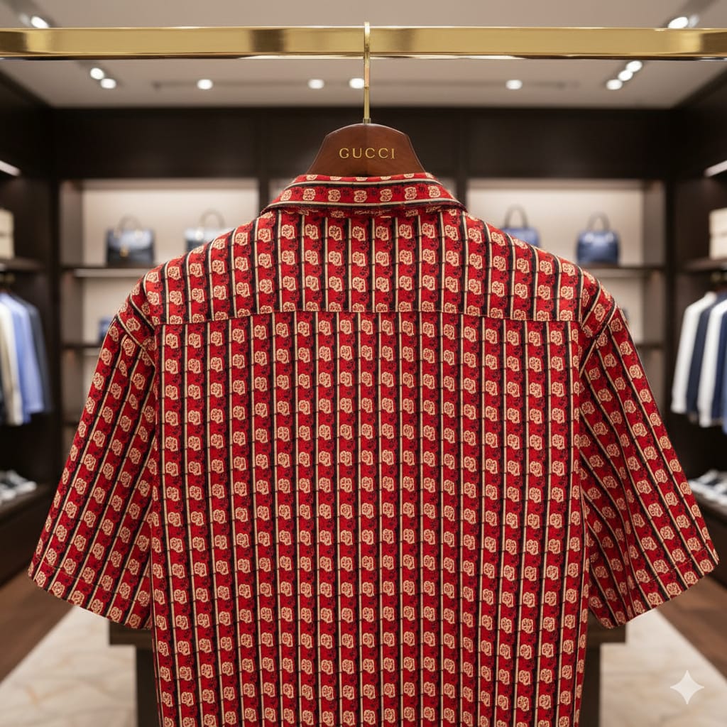 - Striking red base adorned with a repeating geometric print pattern, showcasing brand signature blend of luxury and creativity.