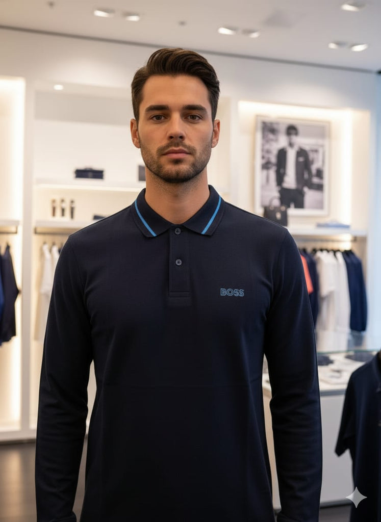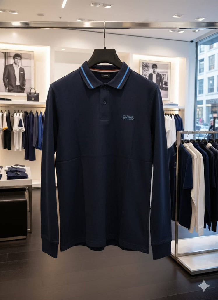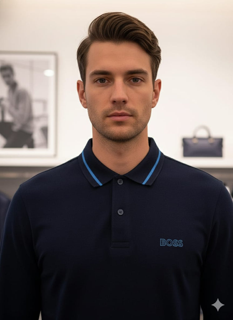 • Contrast-tipped collar in navy, adding a crisp, tailored edge