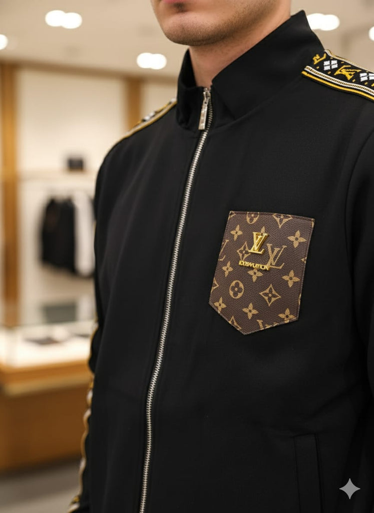Luxury Monogram Trim Black Tracksuit with Signature Detailing