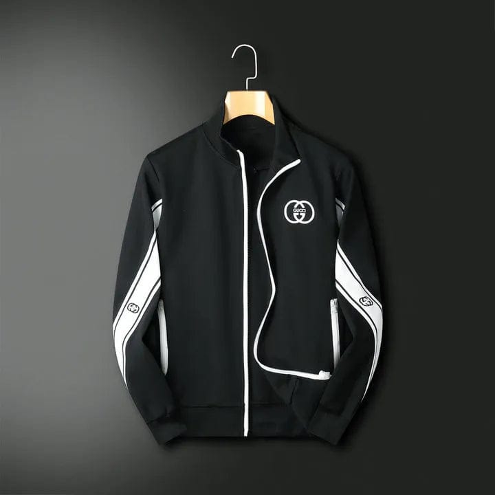 The sleek black design with contrasting white detailing gives it a bold and contemporary edge, ideal for workouts, travel, or daily wear. The jacket features a front zip closure with side pockets, while the jogger pants include an adjustable drawstring waist for a comfortable fit.