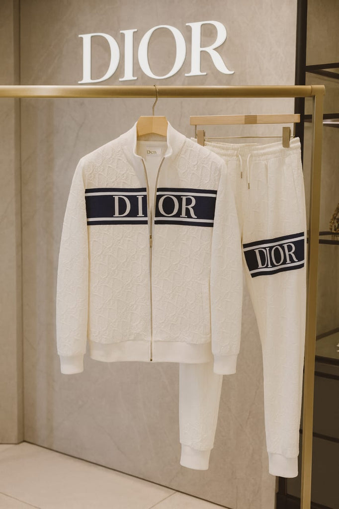 - Zip-up jacket and matching joggers, both adorned with bold white brand logo across a deep navy stripe for a striking contrast