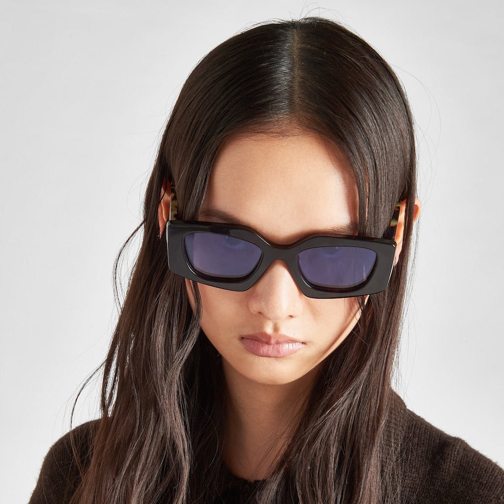 Acetate sunglasses with a geometric design and striking volumes. Bold rims and lively Havana nuances define this frame. The geometric temples are decorated with an iconographic interpretation of brand logo's traditional triangle logo in a contrasting color.
