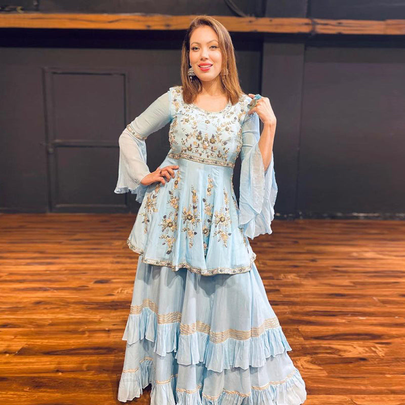 GEORGETTE SARARA WITH RUFFLE FLAIR FULLSTITCHED DESIGNER WORK SUIT