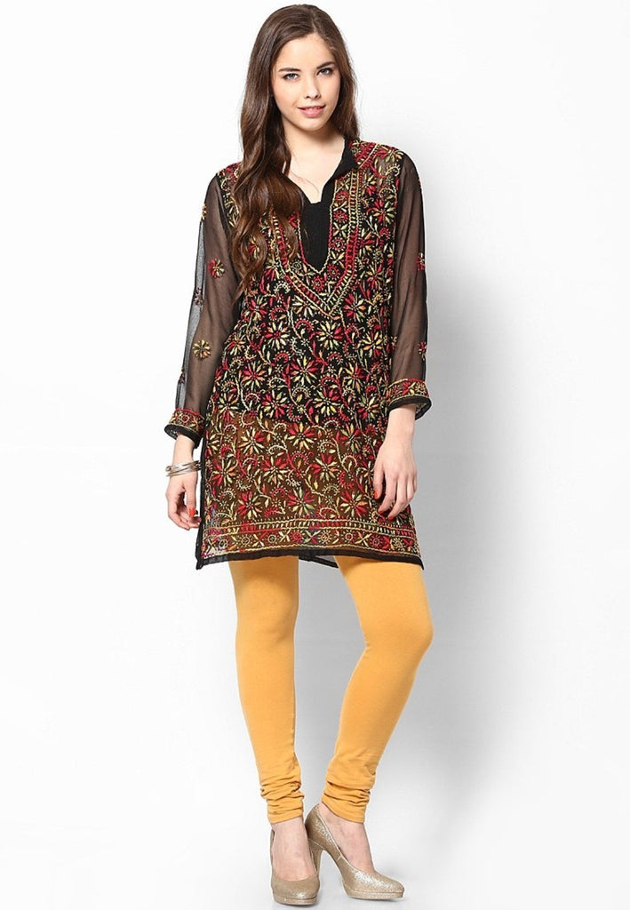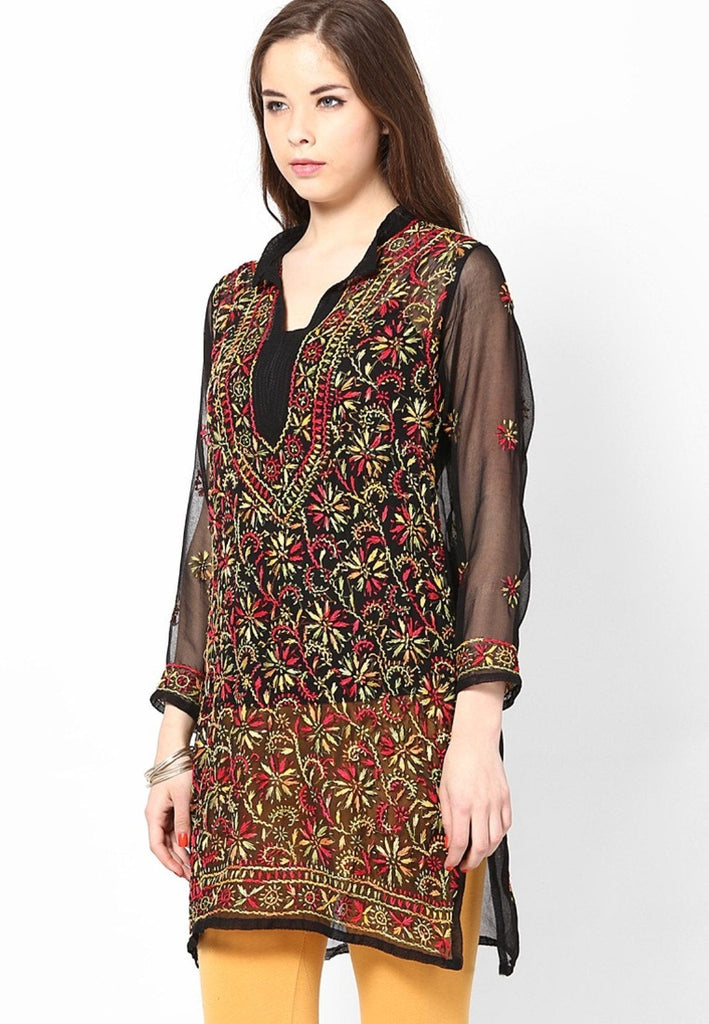 Ethnic Style Chikankari Lucknow embroidery kurtis with Georgette Fabric Chinese Collar. Size Chart M to XXXL which is 38 to 46 inches chest respectively. No Liinning Attached