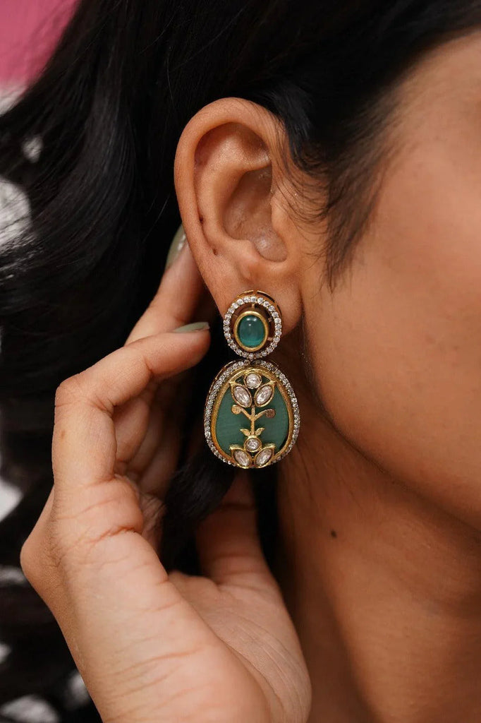 - Each pendant and earring showcases intricate hand-painted green enamel (meenakari) with delicate floral motifs, reflecting exquisite Indian artistry.