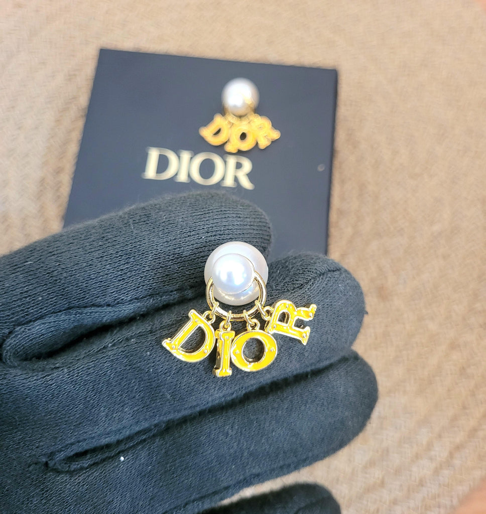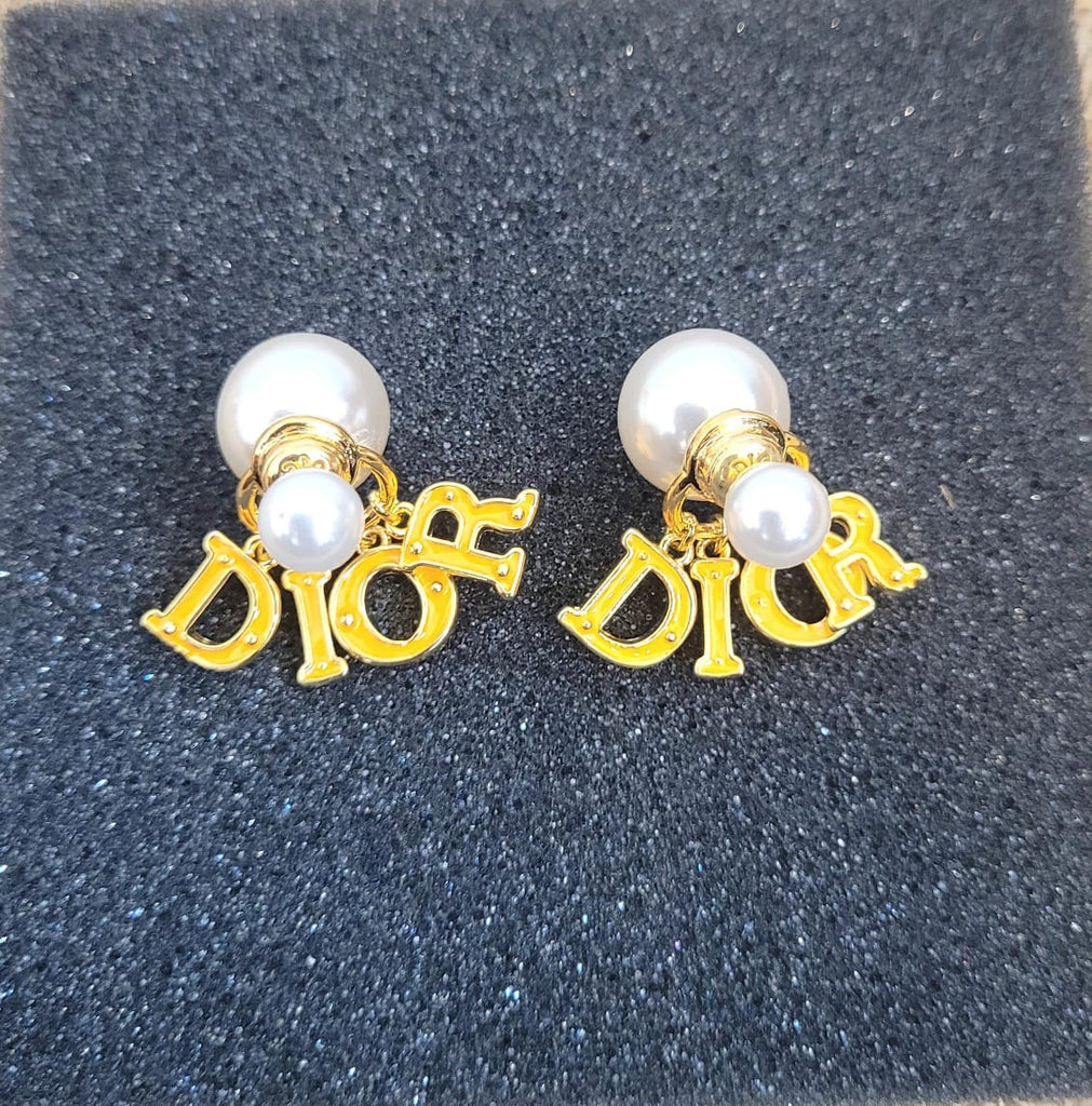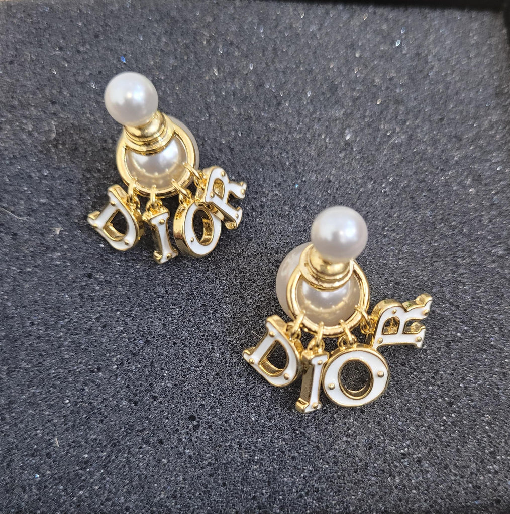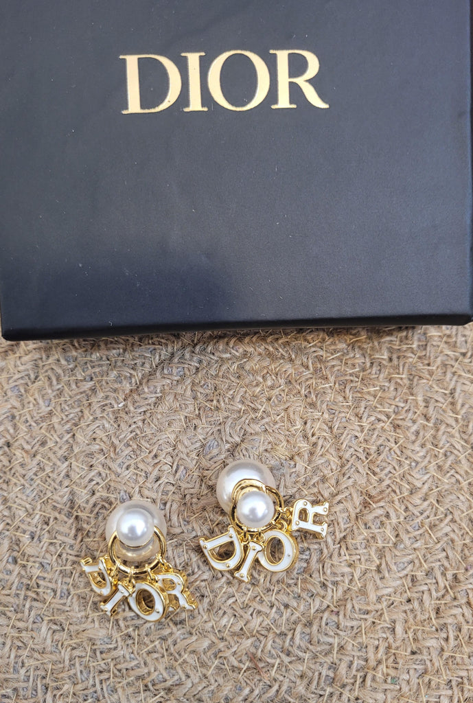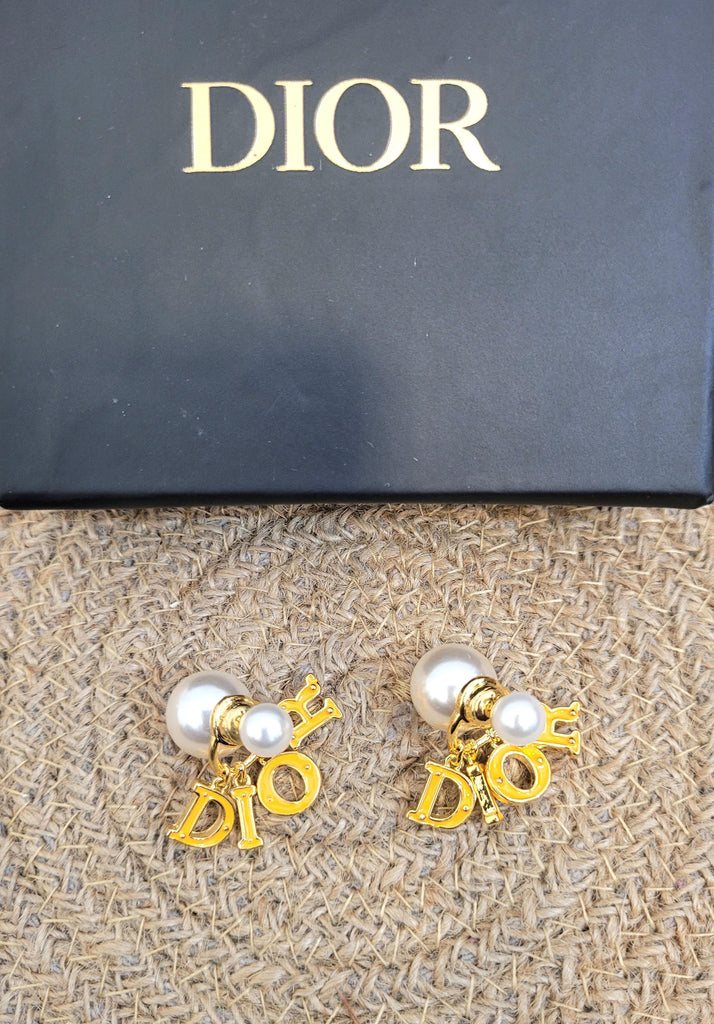 The Brand Tribales earrings offer a new variation on an iconic style of the House. The white resin pearls suspend the letters Brand in gold-finish metal,