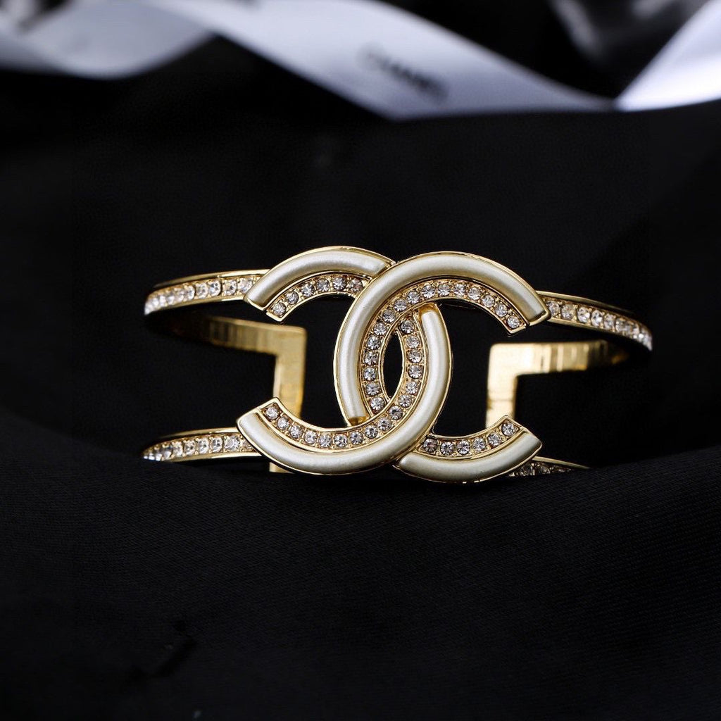 • This elegant open cuff bracelet is crafted of polished Gold metal with an open encrusted crystal CC logo