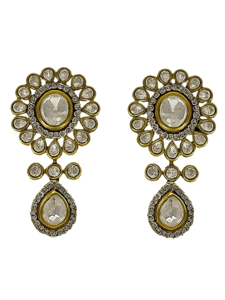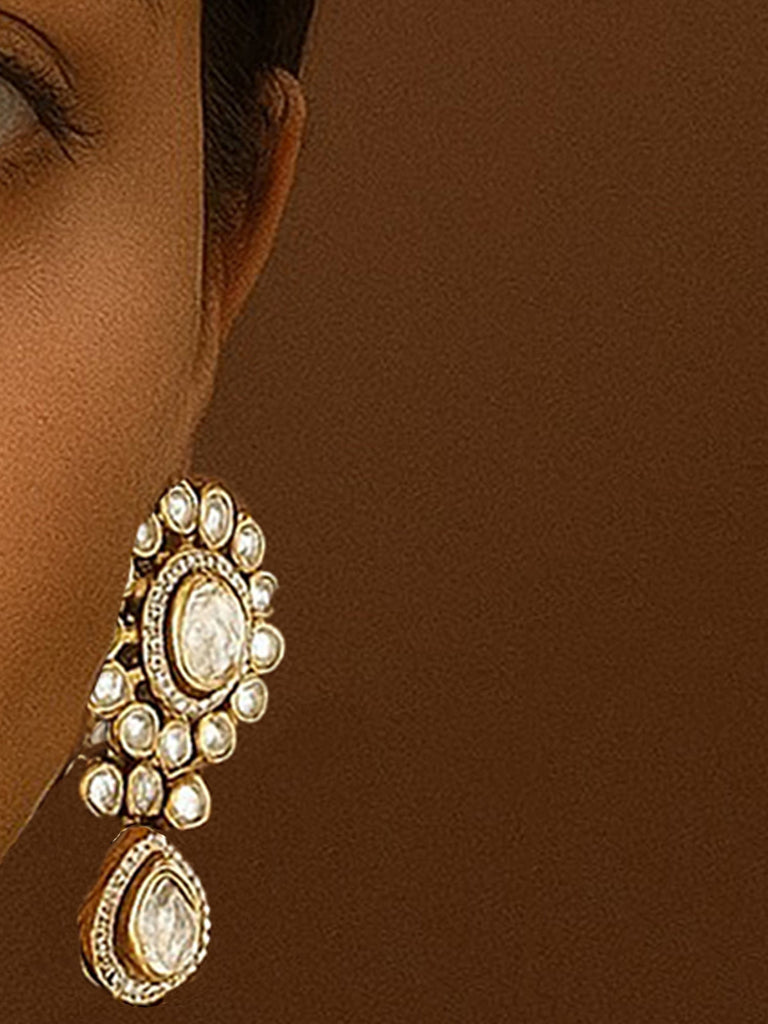 - Matching circular floral studs with teardrop Kundan drops for a graceful finish.