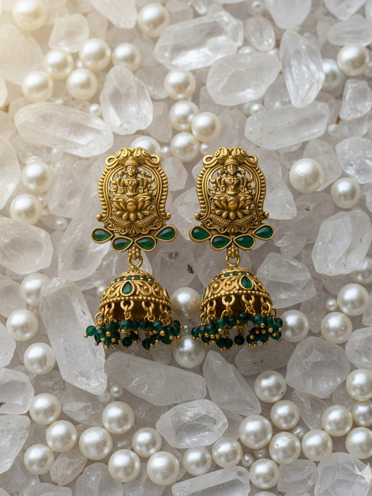 - Comes with a pair of jhumka-style earrings with the same temple design and green bead hangings.