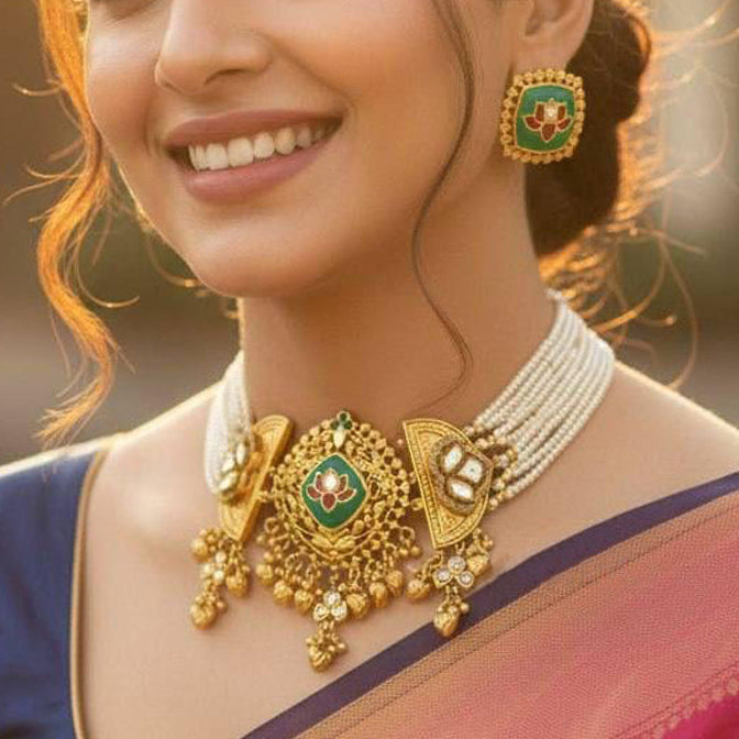 Handcrafted Fusion Brass Choker with Beaded Cheed Design