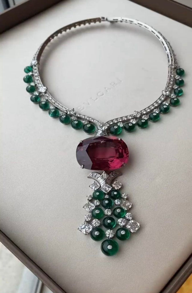 - Showing an intense, feminine and bold hue, is surrounded by a cascade of diamonds and emerald beads, for a Logo bold colour combination of green and hot pink tones.