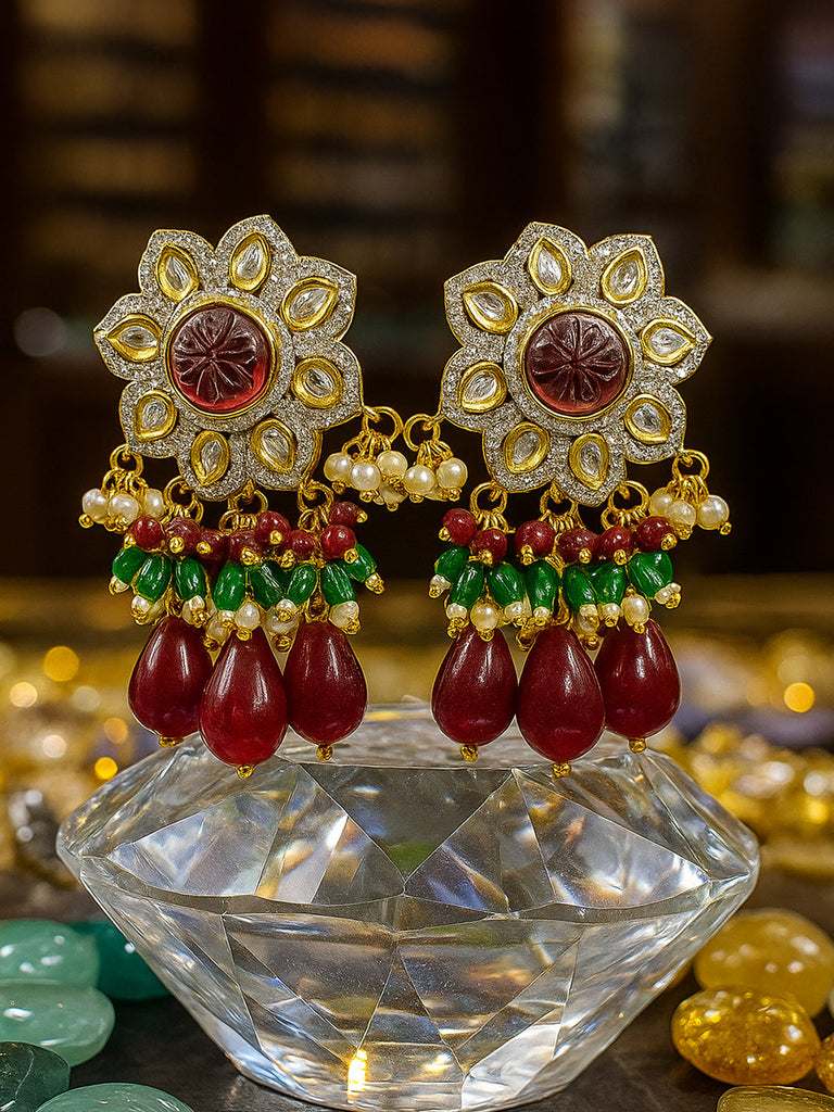- Kundan-studded floral pendant, embellished with shimmering white stones and red accents, creating a majestic centerpiece.